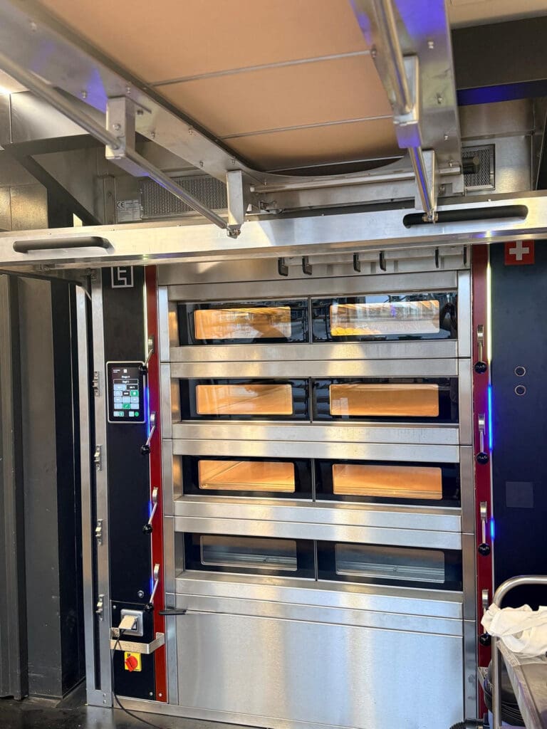 Schamottsteine speichern Wärme besonders gut und geben sie gleichmässig an das Backgut ab. Das sorgt für stabile Resultate und senkt den Energiebedarf. Als Speicherofen nutzt das System die Wärme besonders effizient. Auch die silberverspiegelte Doppelverglasung reduziert Wärmeverluste und verbessert die Arbeitsbedingungen in der Backstube.