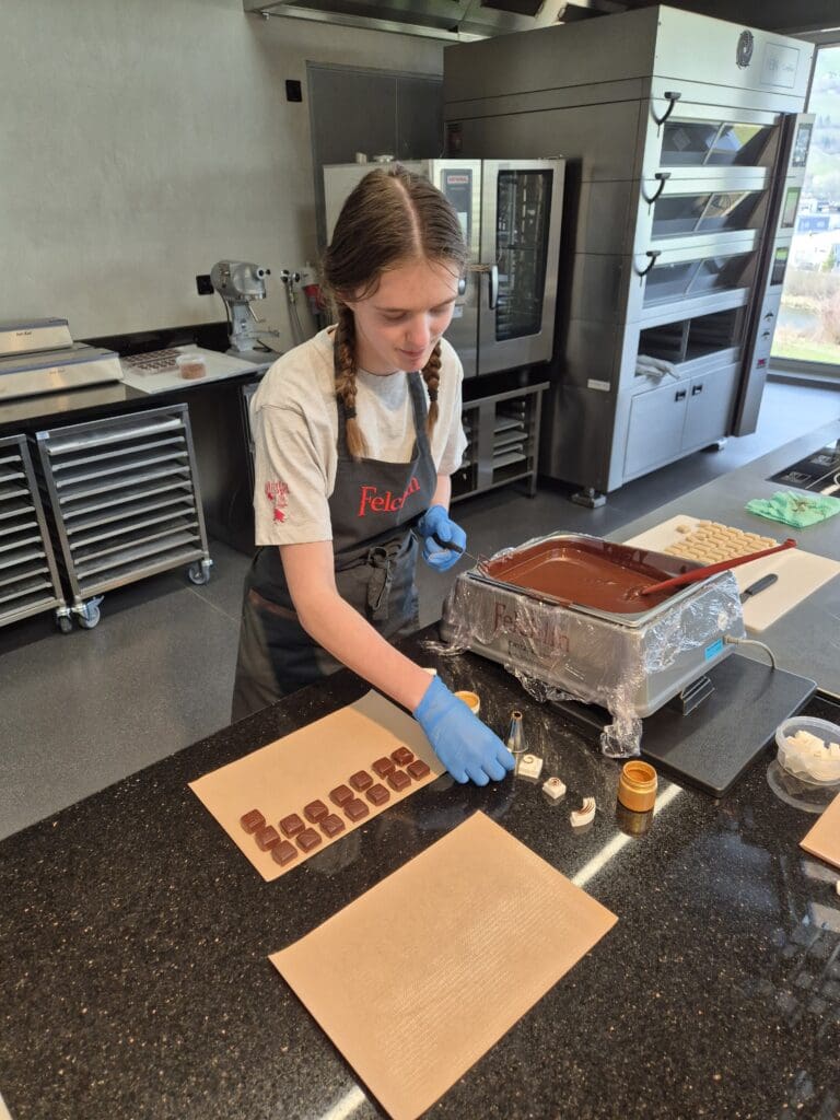 Während zweier intensiver Weiterbildungstage konnte Regula Baschung ihr Fachwissen im Confiserie-Handwerk gezielt erweitern. Anfang März war sie bei der Max Felchlin in Ibach (SZ) zu Gast, wo sie sich dem Thema Praliné und Füllungen widmete. Unter der Anleitung von Ralf Wellauer, Corporate Pastry Chef, erhielt sie wertvolle Einblicke in die Herstellung von Confiserie-Produkten. Vom Sprühen von Pralinéformen bis hin zur Verarbeitung von Ganaches und Giandujas konnte sie ihre Fähigkeiten vertiefen und bestehendes Wissen weiterentwickeln.