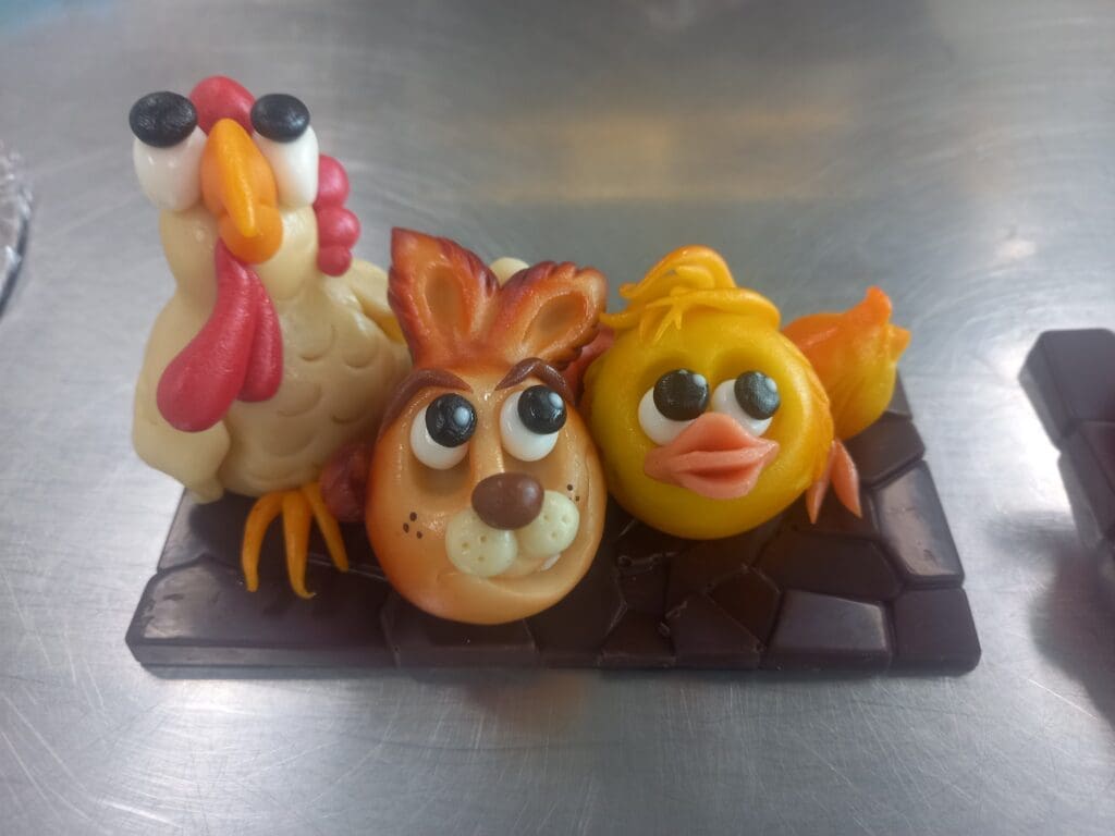 Mitte März reiste Regula Baschung an die Berufsschule Aarau, wo sie einen Nachmittag lang mit Berufsfachlehrer Franz Ziegler in die Welt des Modellierens eintauchte. Passend zur Osterzeit entstanden drei Figuren aus Marzipan, wobei der Fokus auf der Entwicklung aus einfachen Grundformen lag. Ziegler vermittelte anschaulich, wie sich aus wenigen Handgriffen unterschiedliche Tiere gestalten lassen. Besonders beeindruckt zeigte sich die junge Branchenfrau von seiner Fähigkeit, Figuren mit ausdrucksstarken Gesichtern zu kreieren. Darüber hinaus ergaben sich im Austausch über Schaustücke. «Dank seinem grossen Fachwissen habe ich nun viele Ideen entwickelt, um ein umsetzbares Schaustück auf die Beine zu stellen.»